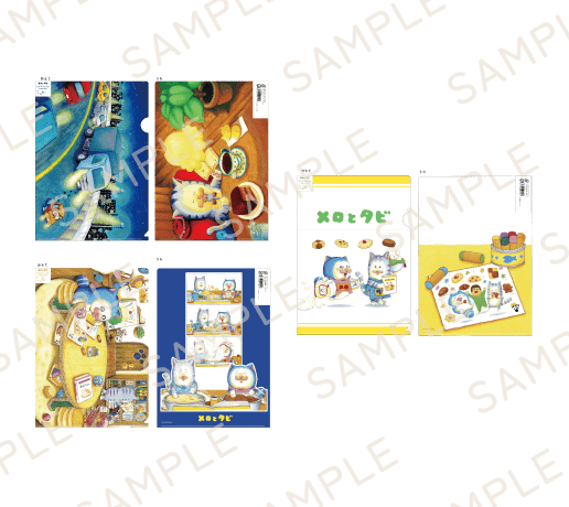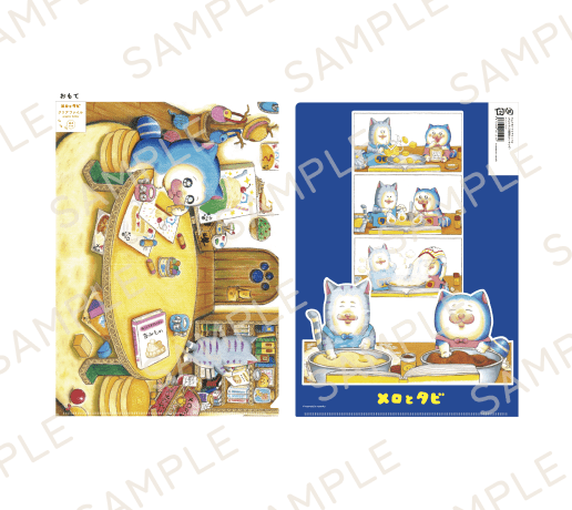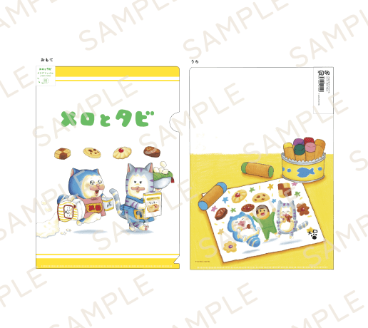 「メロ」と「タビ」がデザインされた、使いやすいA4サイズのクリアファイルが登場!表面と裏面に異なるデザインが施されており、どちらの面もとっても可愛い仕上がりです。書類整理や日常使いにぴったり!展示会の記念やプレゼントにもおすすめです。