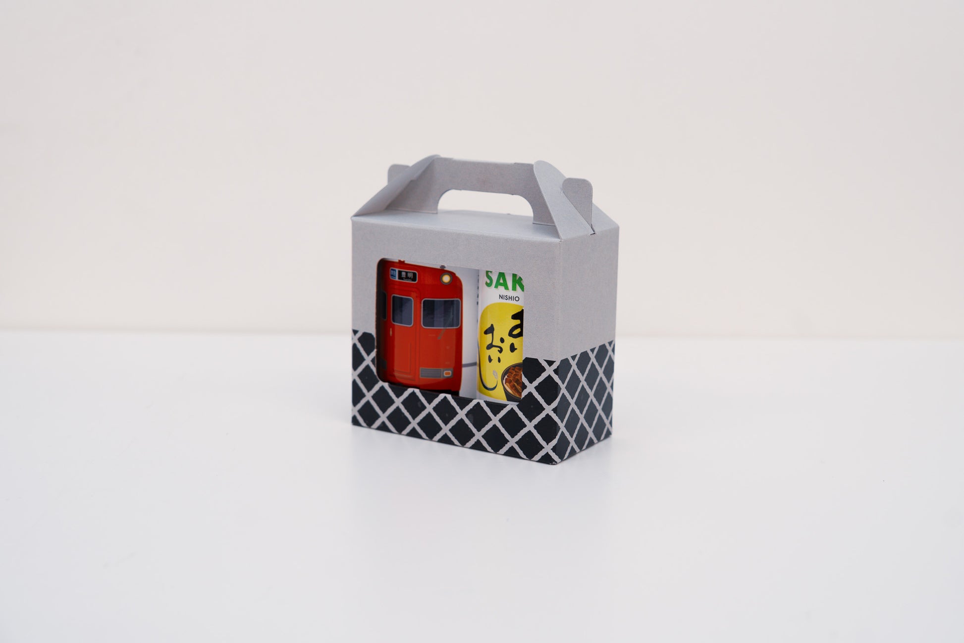 このエリアを走る名古屋鉄道の車両とリンクをさせたラベルデザインの日本酒を入れる専用の箱。